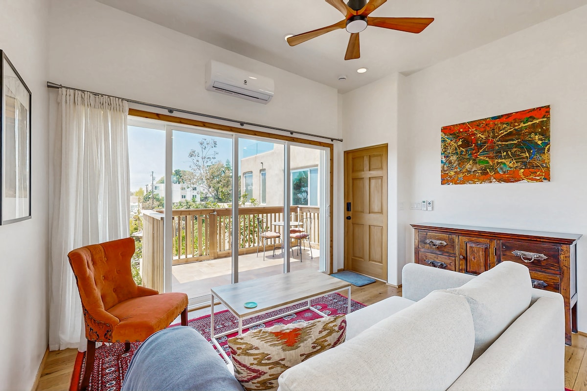 Entfliehe der ruhigen Mango Guest Suite, deiner privaten Oase mit Gartenblick und eigenem Gästeeingang. Entspanne dich in einem modernen, 310 Quadratfuß großen Raum mit einem Queensize-Memory-Schaumstoffbett, einem Zweisitzer-Sofa, einem Essbereich, einer Miniküche mit einem großen Kühlschrank, Klimaanlage und Heizung im Zimmer und Verdunkelungsvorhängen. Entspanne dich in deinem speziellen Terrassenbereich mit zwei Wippstühlen, die einen atemberaubenden Blick nach Osten bieten. Genieße kostenlose Parkplätze, einfachen Zugang zu Del Mar, Torrey Pines Strände/Wanderwege, UCSD und schnelle Verbindungen zum I-5 Highway.