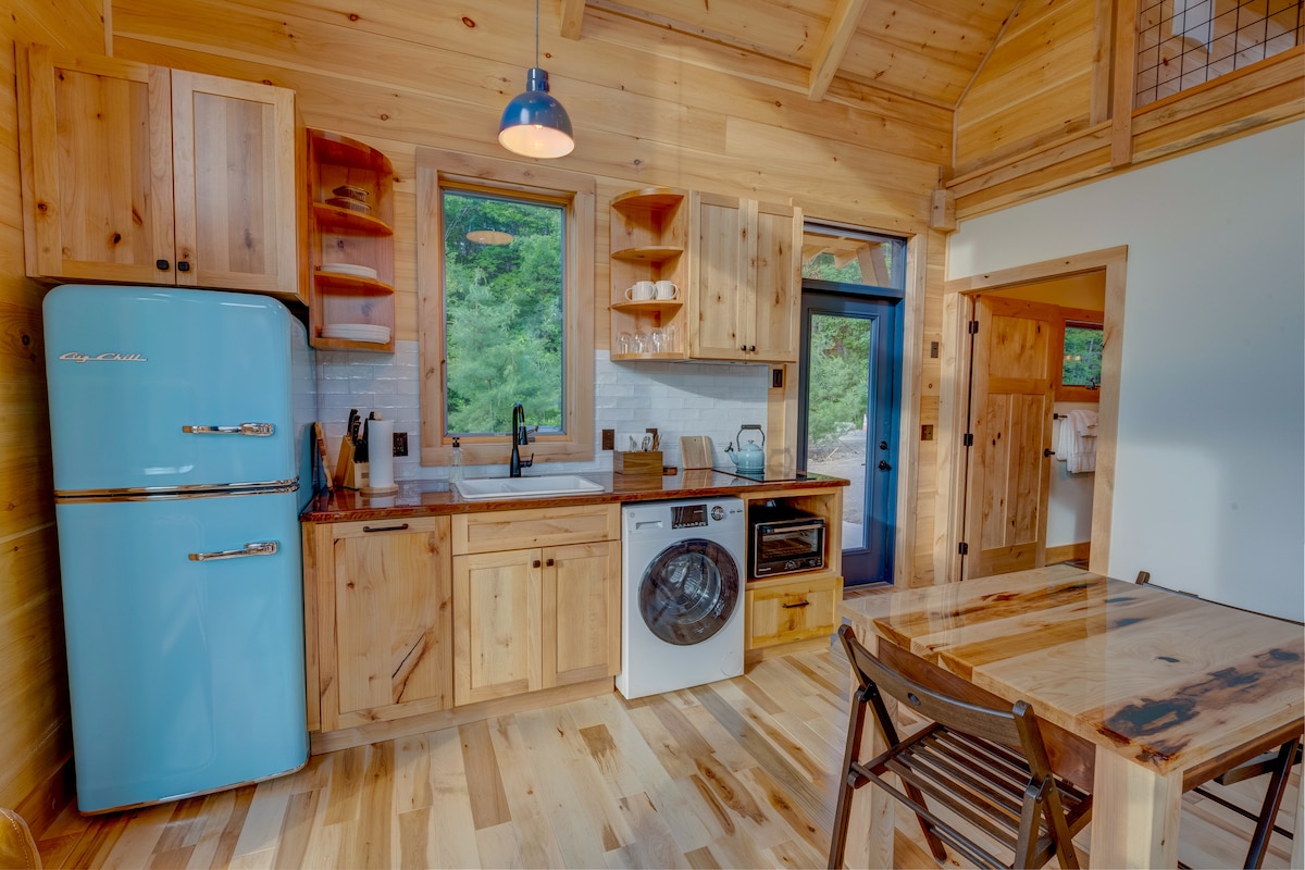 Unsere Familie freut sich, unsere netzunabhängige *lite*-Hütte mit dir zu teilen! Auf unserer Künstlerkollektivfarm gelegen, ist dies unser Lieblingsort auf der Erde. Sie ist hell, schön und farbenfroh. Wir sind 27 Minuten vom Acadia National Park entfernt und von wirklich wunderschönen lokalen Stränden umgeben. Wir bieten super bequeme Betten, Strandcruiser, eine Außendusche, einen Whirlpool, funkelnde Lichter, Sommernächte voller Glühwürmchen, helle Ahornbäume im Herbst und einen gemütlichen Holzofen im Winter.