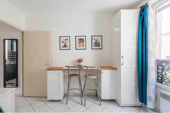 As a food lover, I have created a very personal and unique space for fellow foodies. Located in one of the hippest parts of Paris, my well-equipped kitchen includes a 3m long dining table that seats up to 12 people. The apartment has many original features with a private terrace, bedroom with a double sofa bed, and an original small retro bathroom. While the kitchen is very well equipped all mother comforts are kept to a minimum.