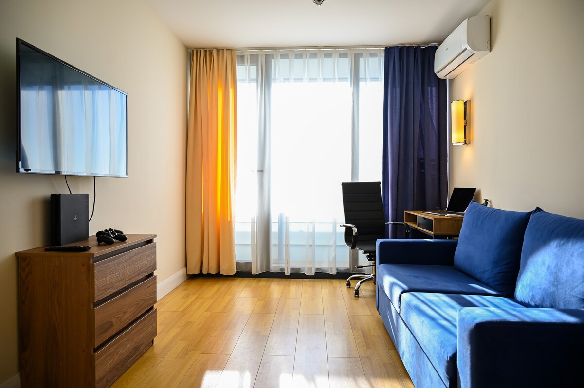 Studio im Boho-Stil im historischen Zentrum von Batumi — Porta Batumi Tower 🌅 Panoramafenster mit atemberaubender Aussicht auf das Meer, die Berge und die Stadt - Badewanne! - Perfekte Sauberkeit und Frische! - Ausgezeichneter Schallschutz! - Warme Böden! - Viele Aufzüge, die ohne Verzögerungen funktionieren 📍 In der Nähe: 🏛 Das Meer, die Altstadt, der Europa-Platz, der Boulevard, Restaurants und Cafés sind nur 5 Minuten entfernt 🛒 Supermärkte, Apotheken, Shisha-Bars und Bars sind in der Nähe 🚘 Bequemer Parkplatz in der Nähe des Hauses