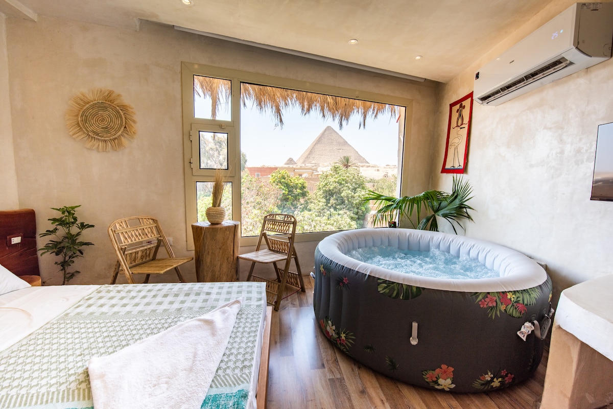 Entfliehe in einen einzigartigen künstlerischen Rückzugsort, wo Natur und Design in perfekter Harmonie zusammenkommen. Dieses handgefertigte Studio, nur 5 Gehminuten von den Pyramiden von Gizeh entfernt, bietet ein immersives Erlebnis mit natürlichen Materialien, maßgeschneiderten handgefertigten Möbeln und atemberaubendem Blick auf die Pyramiden direkt von deinem privaten Whirlpool aus.