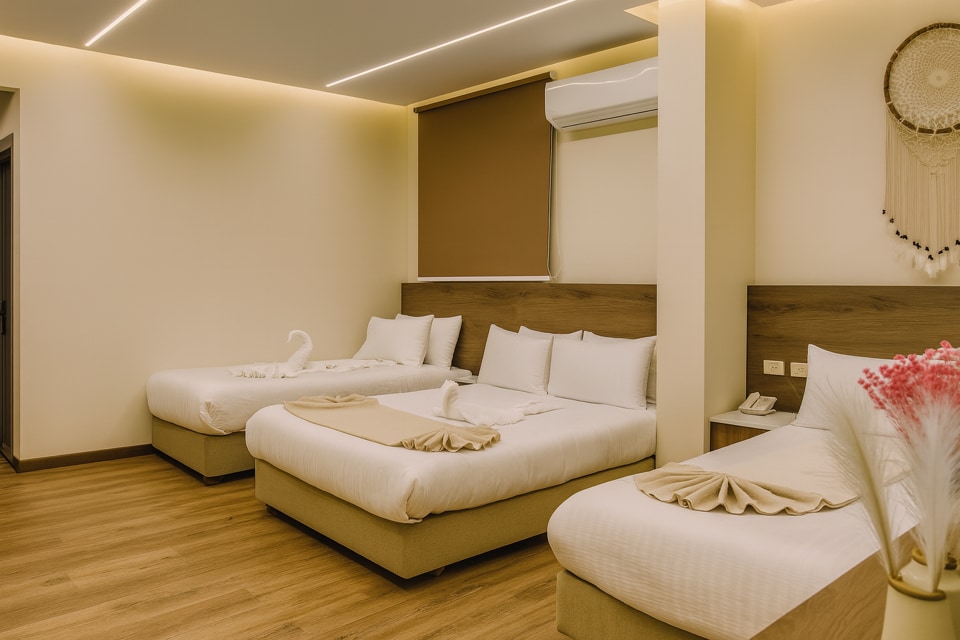 Just 5 minutes from the majestic Pyramids of Giza, this elegant 2-bedroom apartment offers comfort and unforgettable views. One room has 3 large beds, the other a king-size bed. Enjoy a fully equipped kitchen, 2 bathrooms, A/C, TV, and daily breakfast included. Unwind in a spacious outdoor pool or savor meals at our rooftop restaurant with stunning views of the Pyramids and Sphinx. We look forward to welcoming you! Marriage certificate required for Arab guests.