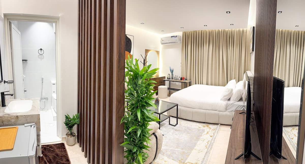إستديو مريح مع جلسة جانبية وركن كوفي موقع إستراتجي يبعد عن كبري نجم الدين ١ دقيقة ، وعن ابرز مشاريع غرب الرياض القدية ٩دقائق حدائق الملك عبدالله ٥ دقائق ونافذ على طريق مكة بمسافة ١ دقيقة، بعيد عن زحمة الحي