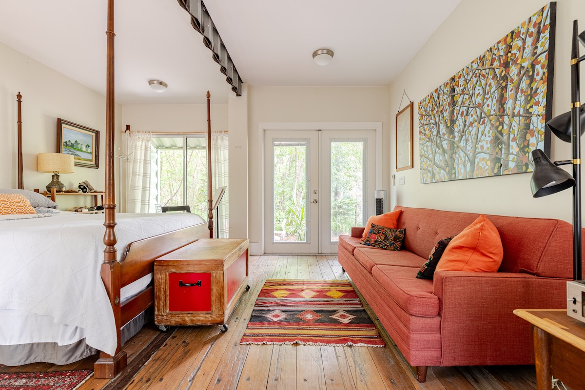 Ruhiges, privates Studio-Ferienhaus mit abgeschirmter Veranda, die auf den geräumigen Hof und die Gärten blickt. Parkplätze an der Straße, nur wenige Gehminuten von der Innenstadt, dem Santa Fe Downtown Campus und mehr als 2,5 Meilen von UF/Shands entfernt. Einfacher Zugang zum Flughafen, zu Bibliotheken, Museen, lokalen Parks, Schwimm- und Radwegen. Kajakfahren, Höhlentauchen und andere Aktivitäten sind nur wenige Kilometer entfernt. Genieße deinen Aufenthalt mit einem komfortablen Queensize-Bett, einem eigenen Badezimmer (Dusche, keine Badewanne), Internet, Kaffee und einer bescheidenen Küche.