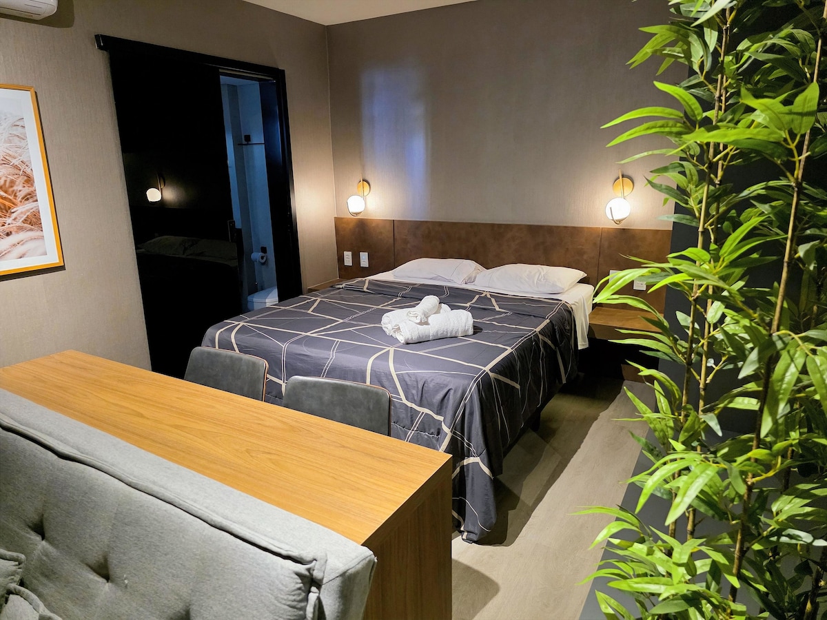 O flat está localizado em um andar alto, proporcionando privacidade e uma vista agradável da cidade. Equipado com Claro TV, incluindo canais Telecine, cama queen, sofá-cama e ar-condicionado. Comodidades do condomínio: • Mercado de alimentos e bebidas • Lavanderia • Academia • Salão de beleza • Recepção 24h com atendimento bilíngue • Estacionamento com manobrista O flat está próximo a alguns dos melhores bares e restaurantes de Goiânia.