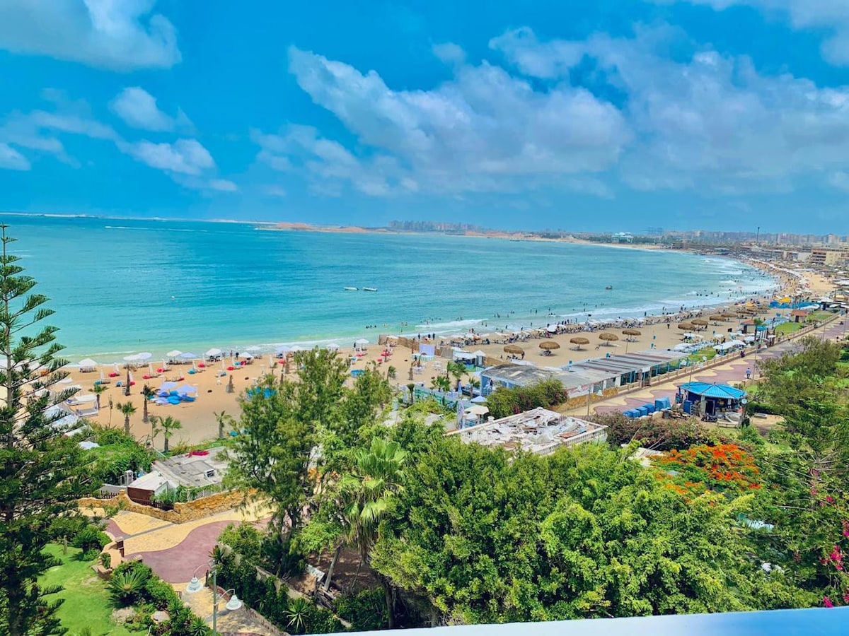 Eine luxuriöse gesamte Einheit mit einem atemberaubenden Blick auf das Mittelmeer, zentrale Lage. Unsere Lage ist 10 Minuten vom schönen Montaza, 10 Minuten vom Einkaufszentrum San Stefano und rund um das Gebäude ist die meisten Sehenswürdigkeit der Stadt, du kannst Shisha im Caffè unter dem Gebäude rauchen, Fisch aus den berühmtesten Restaurants in der Nähe des Gebäudes essen. Du brauchst kein Auto, um alles Notwendige rund um die Unterkunft zu haben.