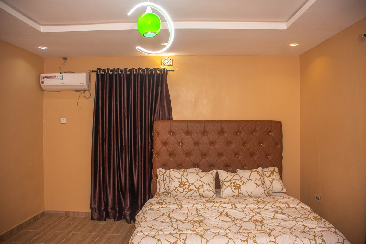 This unique place has its own distinctive style. The standard en-suite room features a semi- orthopedic super king - size comfortable mattress and modern bathroom with water heater. Unlimited super fast 5G Wi-Fi, 43 inches Smart Tv in the room and 55 inches Smart Tv in the sitting room. Netflix, YouTube, DSTV, Smoke alarm, Cctv, 24/7 electricity (Band A) two 50 kva back up generator. Maximum security with security personnel on ground 24/7, 10min to International Airport and Domestic Airports.