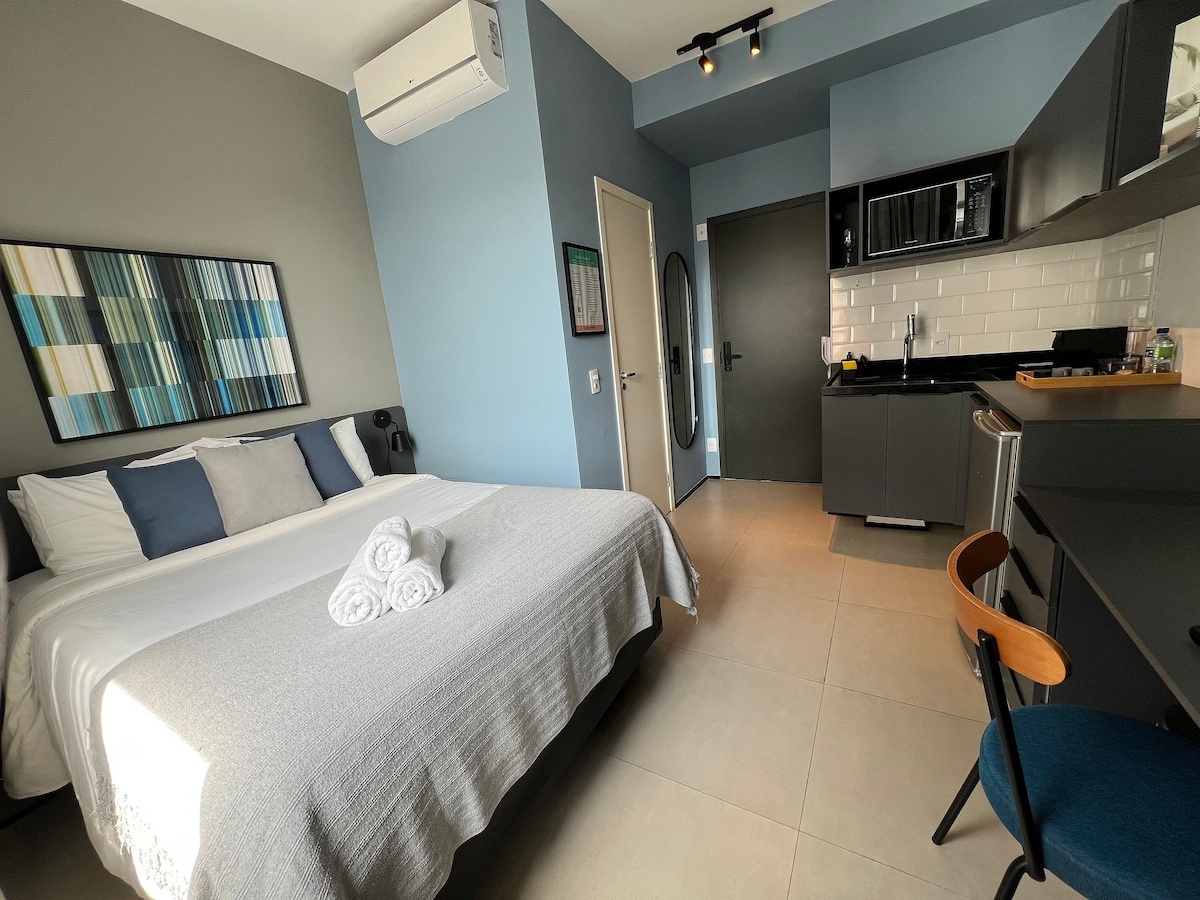 Studio Super Aconchegante in der Nähe der Allianz. Es verfügt über eine moderne Architektur, die in jedem Detail gestaltet ist. Wenn wir an Komfort denken, haben wir uns für ein super luxuriöses Queensize-Bett - Simmons entschieden Voll ausgestattete Küche mit Minibar, Mikrowelle, Kochfeld, Nespresso-Maschine, Sandwichmaker und Wasserkocher. Arbeitsbereich mit WLAN und Smart-TV.Balkon mit Tisch und Terrasse zum Entspannen. Zentralheizungsbad, Haartrockner und Pflegeprodukte. Wir haben einen Minimarkt im Erdgeschoss.