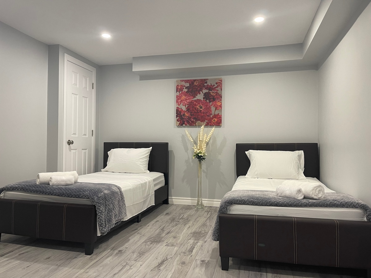 Genieße diese gemütliche Kellereinheit mit 2 Schlafzimmern in einem freistehenden Haus in Mississauga - 5 Autominuten vom Square One, 15 Minuten vom Flughafen Pearson, 30 Minuten von der Innenstadt von Toronto und eine Stunde und 10 Minuten von den Niagarafällen entfernt. ✔ Platz für bis zu 7 Personen ✔ Voll ausgestattete Küche ✔ Komfortable Schlafzimmer mit Kingsize- und Einzelbetten ✔ Wohnbereich mit ausziehbarem Couch und 65 Zoll Smart-TV ✔ Hochgeschwindigkeits-Internetzugang (1,5 GBIT/S) ✔ Kostenloser Parkplatz - 1 Platz an der Einfahrt und Parkplätze auf der Straße mit Genehmigung