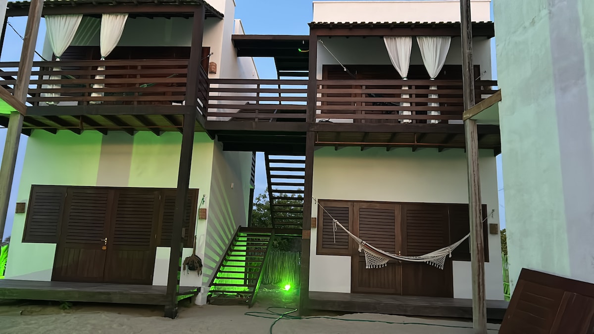 Eine Wohnung für 4 Personen, kombiniert Charme und Funktionalität in einem kompakten Raum. 1 Schlafzimmer mit einem Doppelbett und einem Ventilator, ein weiteres mit einem Doppelbett und einer Klimaanlage, eine kleine ausgestattete Küche und ein Balkon mit Blick auf den Kokosnusshain. Das Fenster ermöglicht den Zugang von natürlichem Licht und der Belüftung und schafft eine einladende Umgebung. Das Studio befindet sich in der Nähe von Casa Janjão und Cabana do Kite, mit Einrichtungen zum Segeln, Mittagessen, Snack und Trinken auf einen Drink. Diese befindet sich in der Straße des Restaurants O Aroma!