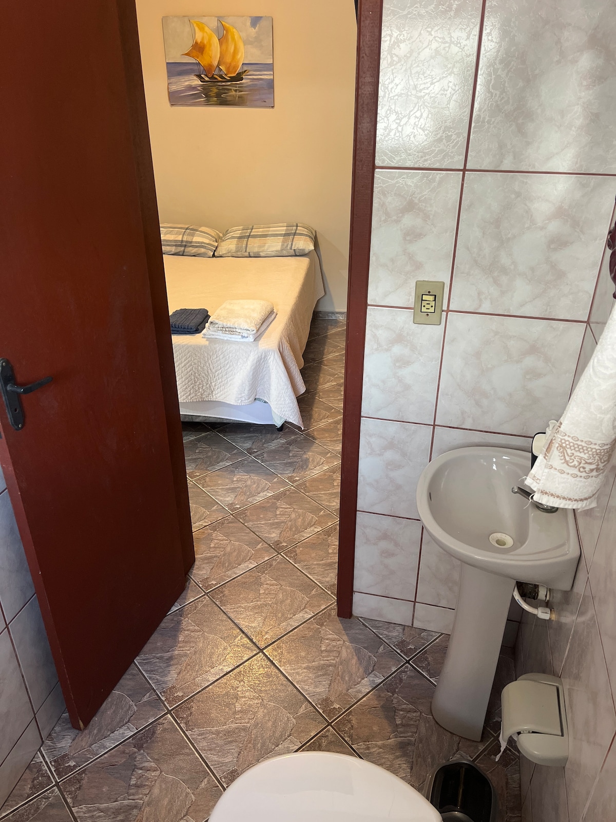 Acesso por senha uma suite só para você com chave na porta, banheiro privado, a 400 m do centro de Antonina a 15km de Morretes. Cama de casal nova, bairro seguro perto do carnaval. Quarto com TV, frigobar, microondas, pratos, talheres. Edícula com laje, fresco, não é forro de PVC. Não aceita PET Não aceita crianças menores que 13 anos Limpeza é feita no início da estadia e depois na saída