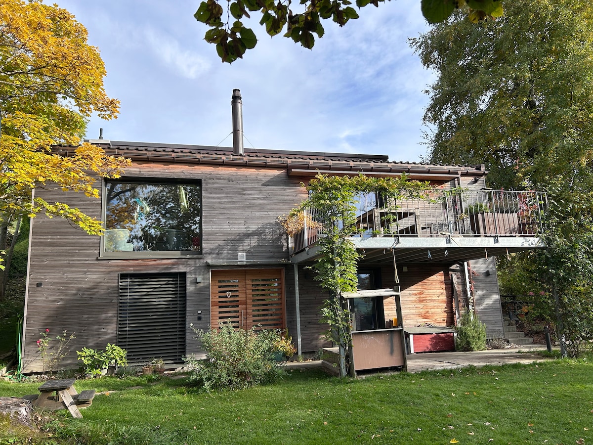 Gemütliches Zimmer mit Blick ins Grüne Unser Gästezimmer auf einem privaten Stockwerk bietet viel Privatsphäre und Ruhe. Es verfügt über ein 140cm Bett und einen schönen Sitzplatz mit Blick ins Grüne. Der private Eingang und ein kostenloser Parkplatz sorgen für zusätzlichen Komfort. Das private WC mit Dusche ist etwas älter, aber sauber und funktional. Gäste können den Grill im Garten mitbenutzen. Perfekt für entspannte Tage in der Natur. Wir freuen uns, Sie bei uns willkommen zu heissen!