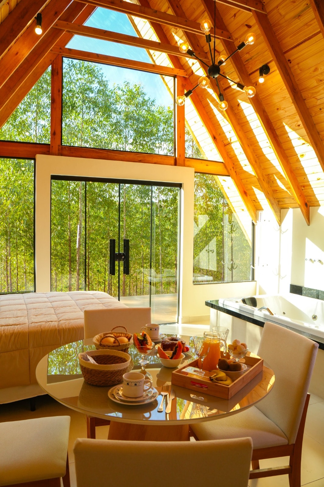 Exklusiver Rückzugsort mitten in den Araukarien! Unsere A-Rahmen-Hütte bietet die perfekte Balance zwischen rustikalem Charme und modernem Komfort. Sie verfügt über ein Schlafzimmer im Zwischengeschoss, ein Wohnzimmer mit einem eleganten Sofa, einen Smart-TV, eine Minibar, ein Badezimmer mit Blick auf die Natur und einen eigenen Balkon. Ideal für Paare, die Ruhe, Romantik und Naturverbundenheit suchen. Erlebe das Beste des Hotel Fazenda Gabro!