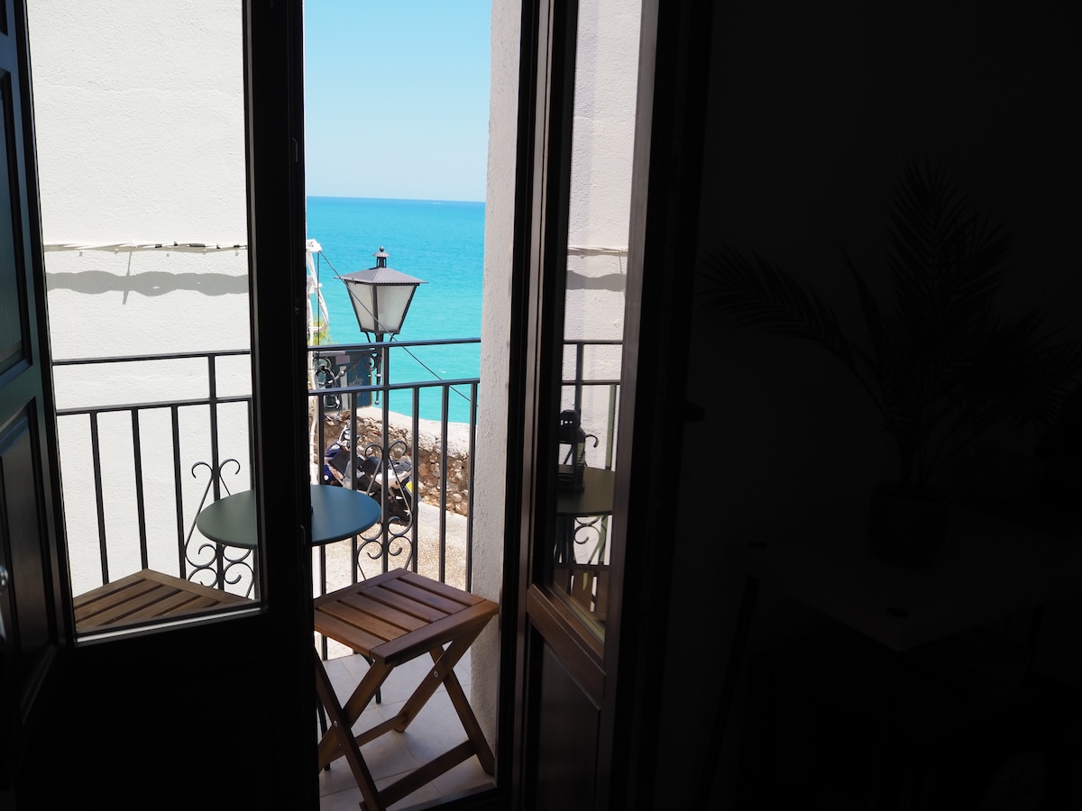 Habitación luminosa y elegante con balcón privado frente al mar. Ideal para vivir la experiencia mediterránea desde arriba, disfrutando de la brisa o de un café al sol. Combina el encanto tradicional con un interiorismo actual. Tras un día de playa o cultura, relájate contemplando el amanecer o el atardecer desde tu propio balcón en pleno casco histórico de Peñíscola.