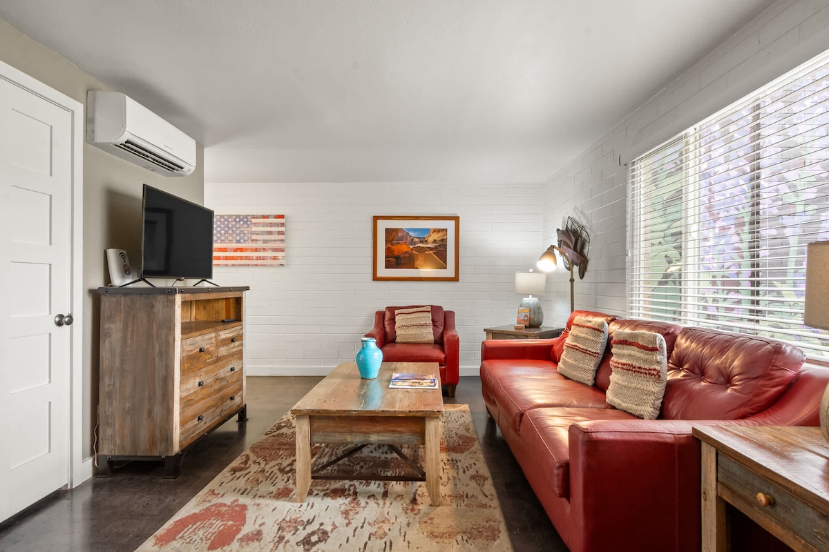 Diese barrierefreie Eigentumswohnung im Erdgeschoss befindet sich in der Innenstadt von Moab. Moderne, voll ausgestattete Küche, geräumiges Schlafzimmer mit zwei Schlafzimmern, zwei Badezimmern und einer privaten Terrasse mit einem Weber-Gasgrill. Hauptschlafzimmer mit Kingsize-Doppelbett und eigenem Bad. Das zweite 2 Zweibettzimmer bietet privaten Zugang zum Badezimmer. Das offene Wohnzimmer verfügt über ein Queensize-Schlafsofa und einen privaten Terrassenzugang. Enthält 2 ausgewiesene Parkplätze.