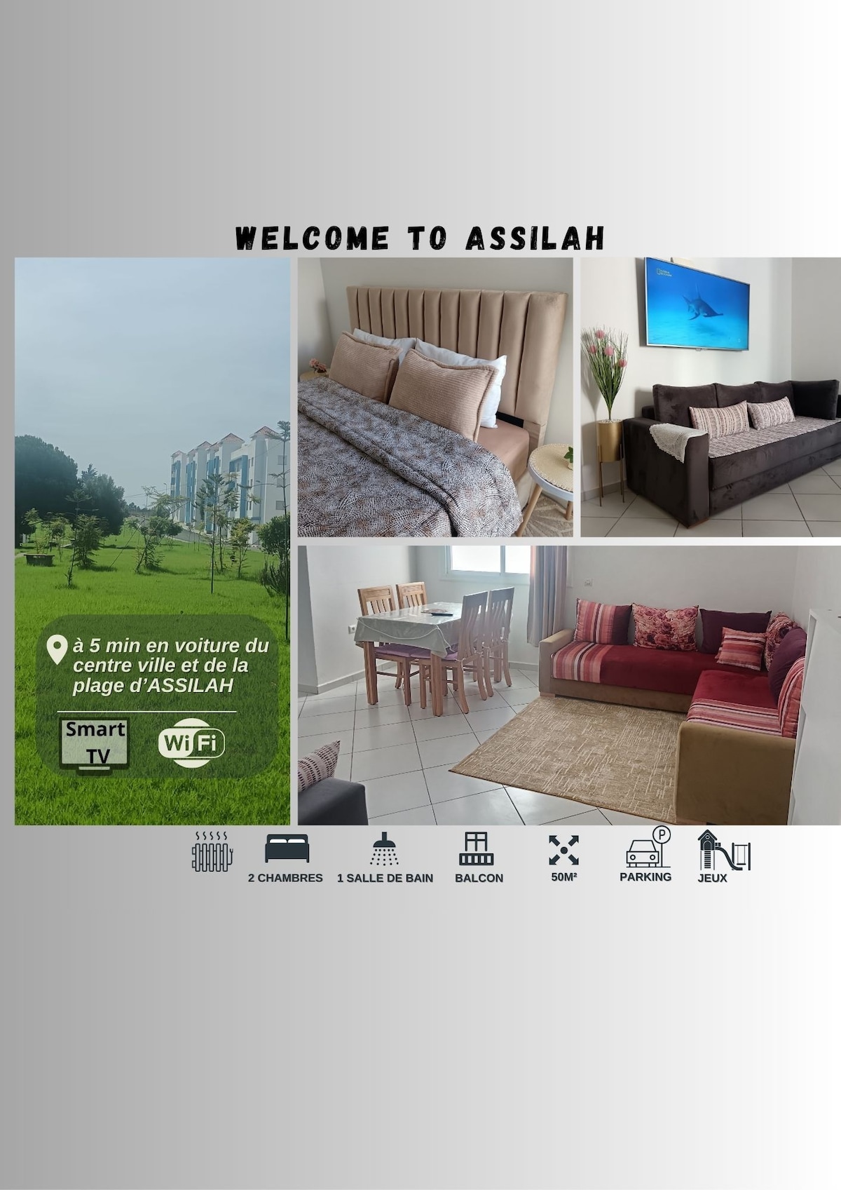 ein ruhiger und stressfreier Ort mit einem Hauch von Natur, Willkommen in unserer 2-Zimmer-Wohnung in Assilah: - im 2. Stock, 500 m von der Autobahn A5, 5 Min. zum Zentrum und Strand, - Pools mit Handtuch, - Beobachte deine Kinder im Pool vom Balkon aus; - mobiler WLAN-Router; Android-TV 55, - 2 geräumige Zimmer + 3 Betten, eines für Babys; - voll ausgestattete Küche mit Elektroherd; - kann bis zu 6 Gäste beherbergen + 1 Bett für Baby; - 24/7 Sicherheit + kostenlose Parkplätze; - Lebensmittelgeschäft im Haus - gepflegter Garten - Kinderspielplatz