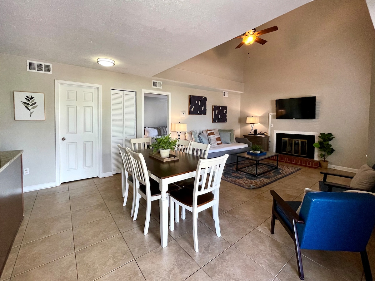 Wir wünschen dir einen schönen Aufenthalt in unserem Auburn Townhome! Dieses zweistöckige Haus bietet Platz für 6 Personen. Es gibt 2 Hauptschlafzimmer – oben und unten. Außerdem gibt es ein großes Loft mit einem Ausziehbett (für 2 Personen). Du wirst es lieben, dich im Arbeitszimmer mit seiner hohen zweistöckigen Decke zu entspannen. Dieser Bereich verfügt über einen Flachbildfernseher und einen Kamin. Die Küche ist ein Wohnküche und draußen befindet sich eine private, überdachte Terrasse mit Feuerstelle. Es befindet sich in großartiger Lage nur 4 Meilen (ca. 10 Minuten Fahrt) von AU entfernt. Ich hoffe, du kannst unser „zweites Zuhause“ besuchen!