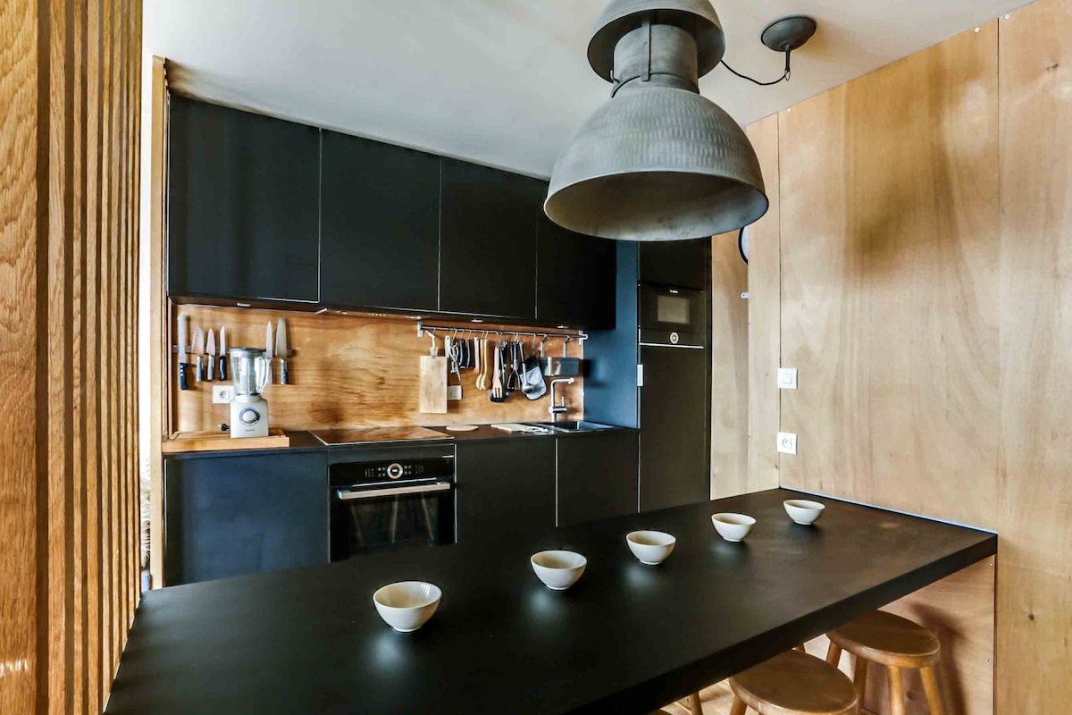 Genießen Sie eine stilvolle und zentral gelegene Unterkunft. - 4 Schlafmöglichkeiten: 1 Doppel-Schlafsofa, 2 Einzel-Etagenbetten. - Ausgestattete Küche (2-Flammen-Induktionskochfeld, Dunstabzugshaube, Kombi-Mikrowelle, Dolce Gusto Kaffeemaschine, Filterkaffeemaschine, Toaster, Wasserkocher, Raclette- und Fonduegeräte, Crêpe-Maschine) - Großer Raum mit 1 Schrank, 1 Tisch , 3 Hochstühlen, 2 Hockern, 1 TV - Badezimmer mit 1 Waschmaschine, 1 Heizkörper, 1 Haartrockner. - Separates WC