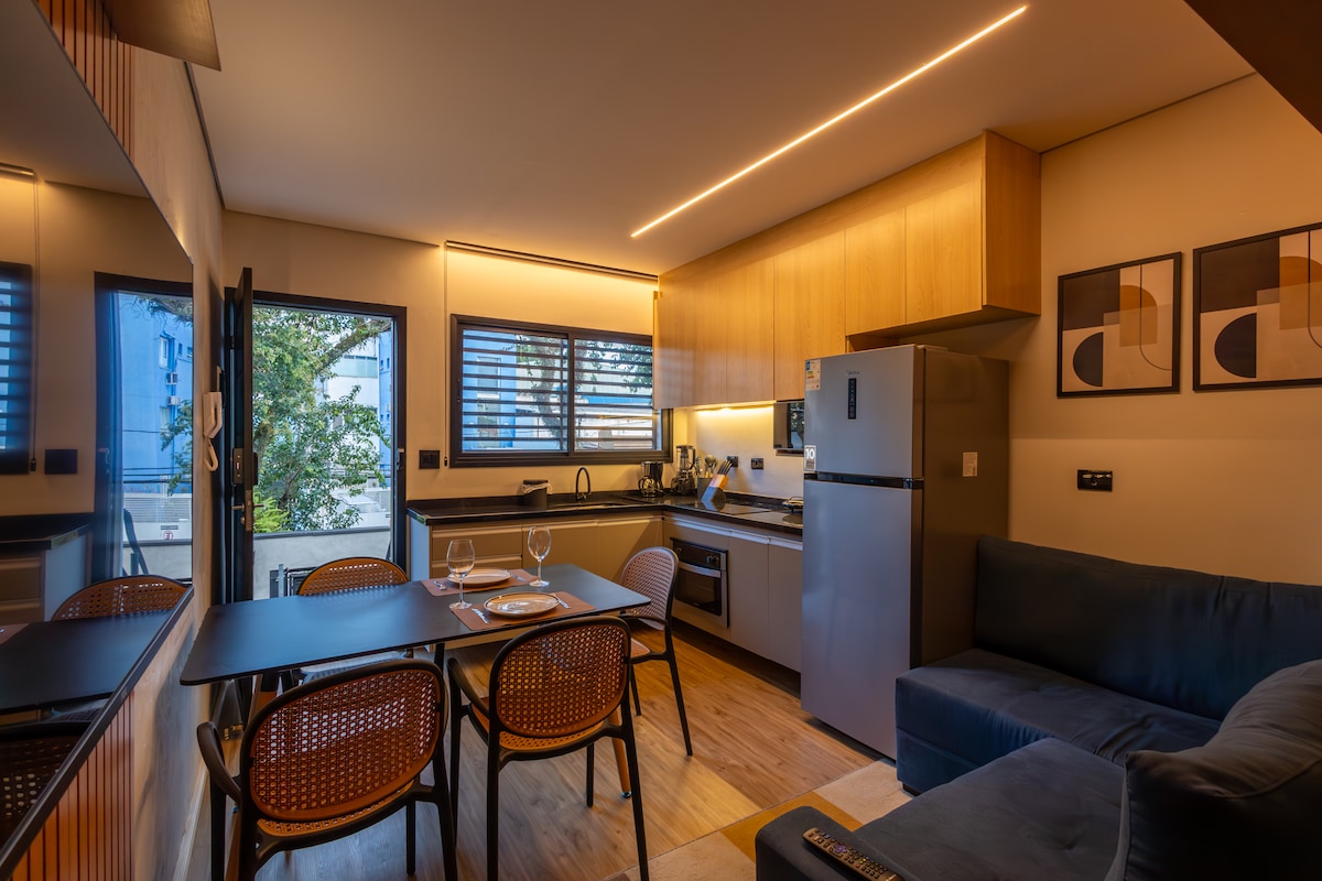 Luxus-Studio in der Rua Oscar Freire Modern, anspruchsvoll und komplett, in der berühmtesten Straße von São Paulo für Luxusgeschäfte. Studio im 24. Stock, nach vorne, mit herrlichem Blick auf die Av. Paulista. Gut ausgestattet mit 55-Zoll-TV, WLAN-Internet Vivo Fibra 200, Kabelfernsehen, leiser Klimaanlage, Kaffeemaschine, Kochfeld und Minibar, automatisiertem Verdunkelungsvorhang, tragbarem Dampfreiniger, Küchenutensilien, Haartrockner, weichen Bettwäsche und Handtüchern, Seife und Shampoo/Conditioner-Set.