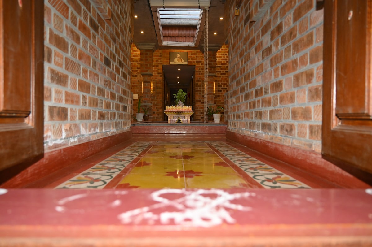 Genieße das Leben in der Natur in einem Bio-Bauernhof, wo du dich selbst vergessen und eins mit der Natur werden kannst. Diese Unterkunft ist von einem privaten Mango-Obstgarten, einem Reisfeld, einer Bananenplantage und einem leeren Gelände umgeben, das sich für die Durchführung von Veranstaltungen oder zum Spielen von Cricket eignet. Der Bauernhof hat auch Vieh. Du gehst in ein Haus im traditionellen Tamilnadu-Stil. Es gibt 4 Schlafzimmer mit jeweils einem Flur und einem privaten Balkon. Es gibt einen Speisesaal mit angeschlossener Küche, Handwaschbecken und Badezimmer.