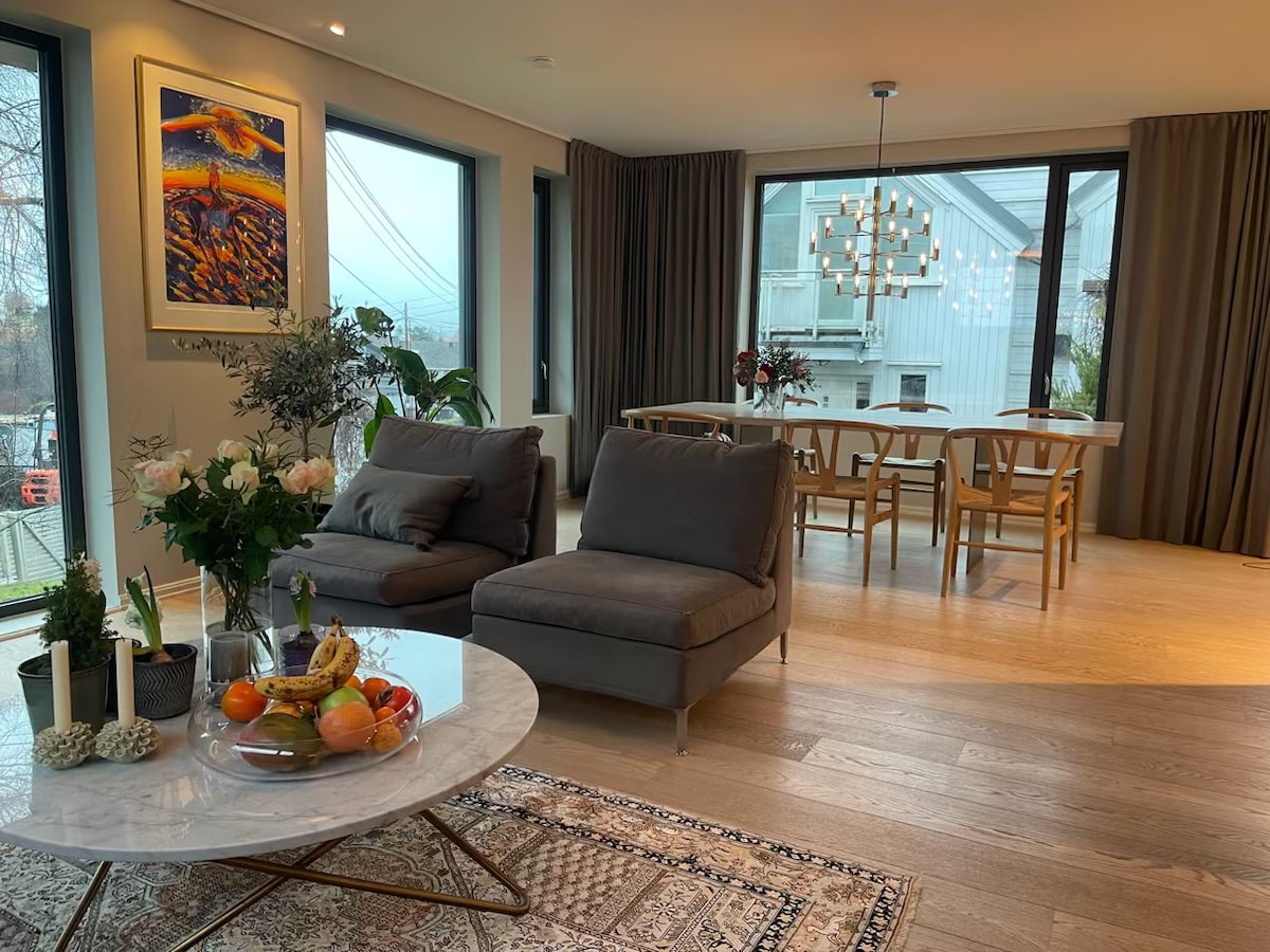 Moderne Dachgeschosswohnung im ruhigen, familienfreundlichen Fornebu. Schlafmöglichkeiten für 4 Personen mit einem Doppelbett und einem Schlafsofa. Hell und stilvoll mit eigenem Balkon und viel natürlichem Licht. Eine Treppe höher befindet sich eine gemeinsame Dachterrasse. Voll ausgestattete Küche, schnelles WLAN und Zugang zum Aufzug. Tolle Busverbindungen ins Stadtzentrum von Oslo und nur wenige Gehminuten von der Unity Arena entfernt. In der Nähe von Stränden, Parks, Geschäften und Wanderwegen. Ideal für Familien, Paare oder Geschäftsreisen. Erschwingliche gebührenpflichtige Parkplätze in der Nähe verfügbar.