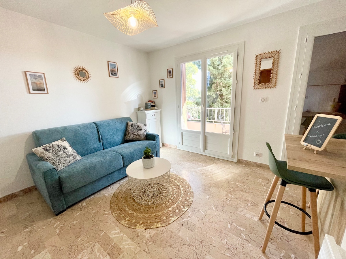 Entspannen Sie sich in dieser komplett renovierten, komfortablen, 2-Zimmer-Wohnung, unabhängig, ebenerdig, klimatisiert mit einem großen privaten Garten und sicherem Autoüberstand. Zu Fuß 5 Minuten vom Meer entfernt, um die verschiedenen Buchten zu erreichen, 10 Minuten zum Sandstrand und 15 Minuten zum Stadtzentrum (Geschäfte und Hafen). Privater Garten: Essecke unter Pergola, mit Plancha, Kühlschrank/Gefrierschrank, Sitzecke, Solarium mit Liegestühlen und Spielen (Tischtennis und Petanque) und warme Außendusche und Wäscheständer.
