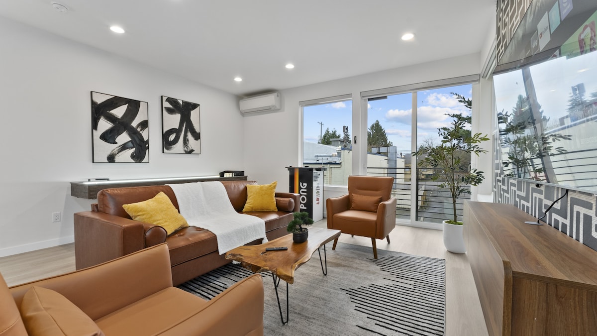 Ultimate view property showcasing expansive Mt. Rainier and skyline views. A stunning modern and urban multi-level townhouse with floor-to-ceiling windows, contemporary kitchen, and a spacious rooftop deck with a large gas fire pit! Luxury accommodation run by friendly locals, here to make your stay relaxed and seamless :) There are two private bedrooms, and a queen size sofa bed in the main living space. ** PLEASE NOTE: The private garage will only accommodate a small SUV or smaller.