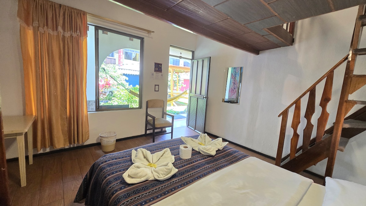 Inviting double room ideal for travelers who want comfort without overspending. Bathroom is shared and kept exceptionally clean. Guests enjoy access to wide-open grounds, rustic design, relaxing common spaces, and convenient parking. Close to Baños’ most popular destinations while offering a peaceful retreat surrounded by nature.