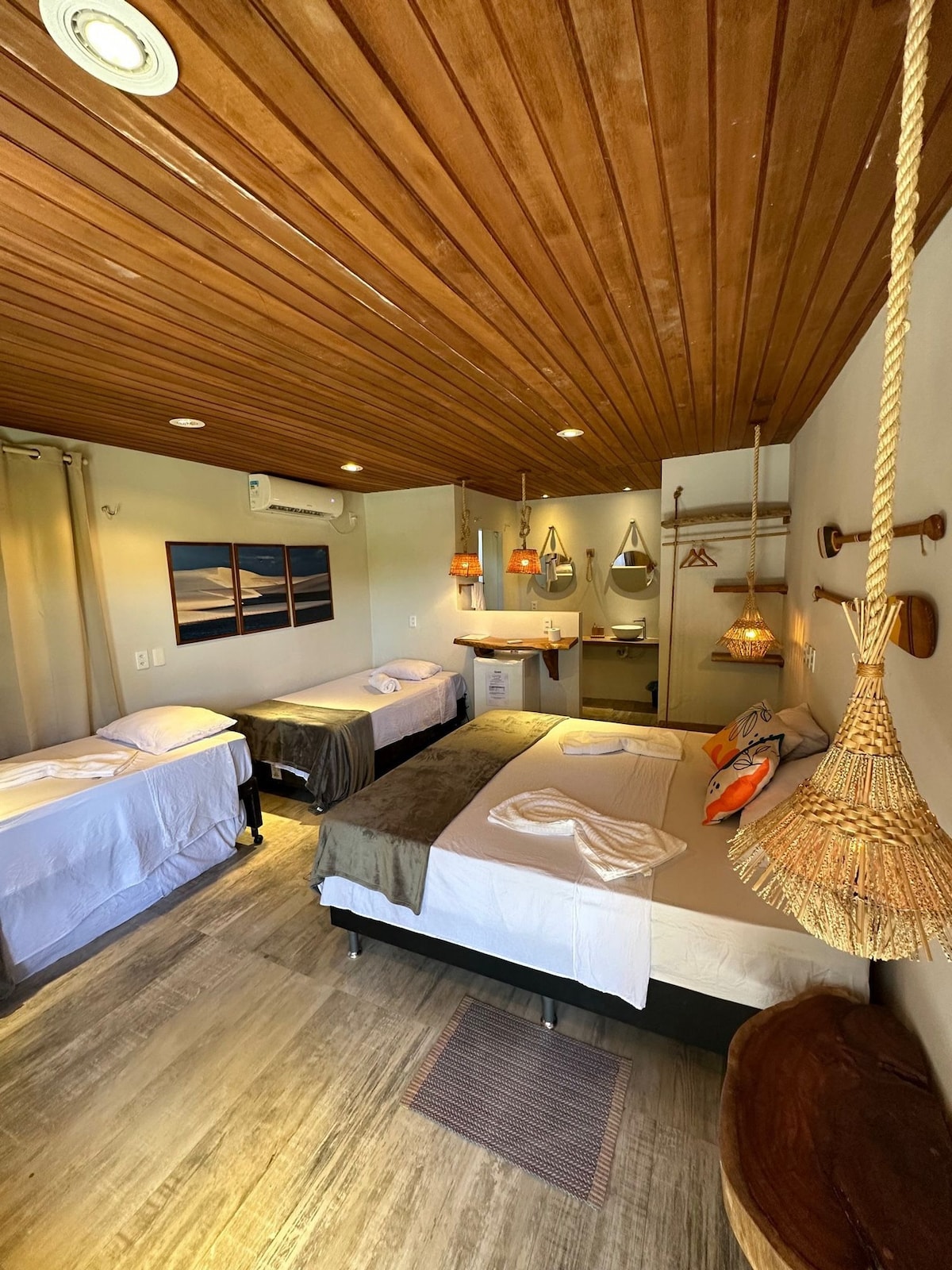 Genieße im Restinga Chalé unvergessliche Momente in einem Öko-Resort in Barreirinhas. Gemütliches Chalet, ideal für Familien oder eine Gruppe von Freunden. Geräumig, bietet Platz für bis zu 6 Gäste, mit 2 komfortablen Schlafzimmern, 2 Doppelbetten, 4 gut verteilten Einzelbetten und 2 Badezimmern. Zugang zu Lençóis durch akkreditierte Agenturfahrzeuge. Ruhige Umgebung, perfekt zum Ausruhen nach den Touren in Lençóis Maranhenses. Komfort, Zweckmäßigkeit und tolle Lage, um das Beste der Region zu genießen