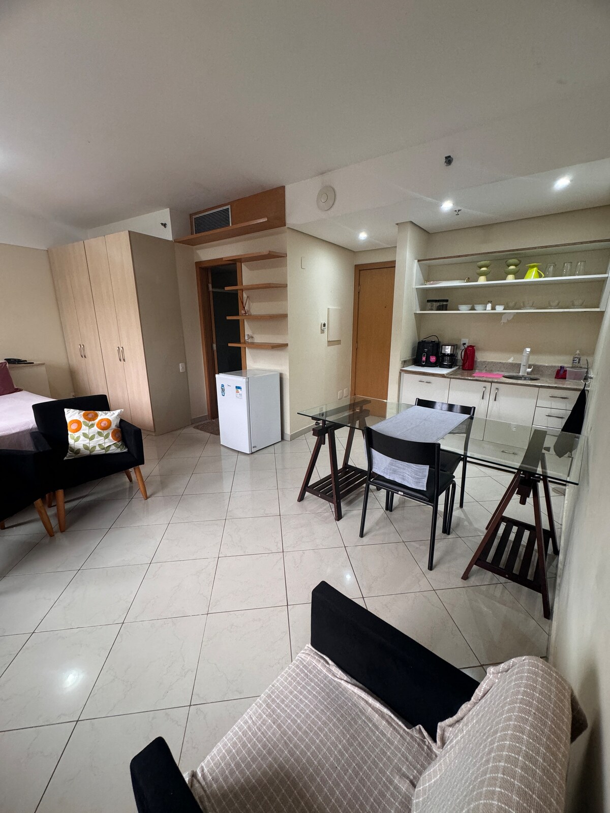 Sinta o conforto e a praticidade deste flat moderno, com decoração que combina revestimento amadeirado, iluminação planejada e detalhes contemporâneos. A sala e quarto contam com TV de tela plana e internet de alta velocidade, garantindo entretenimento e produtividade. O espaço de trabalho exclusivo é perfeito para home office. Oferece 1 vaga de garagem, sofá amplo e confortável, além de um ambiente integrado que une charme, funcionalidade e aconchego para estadias de lazer ou negócios.