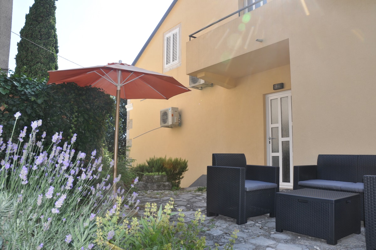 Schöne neue komplett renovierte Wohnung (Jahr 2022) mit herrlichem Blick auf das Meer. Das Haus befindet sich außerhalb der Stadt in einer ruhigen Gegend, zwischen Kiefern und Pflanzen. Genieße deine Mahlzeiten auf der Terrasse, die mit einem traditionellen Steingrill zubereitet werden, mit einem natürlichen Kiefernschatten. Der öffentliche Steinstrand befindet sich direkt vor dem Haus, sodass du zu jeder Tages- und Nachtzeit sauberes Meer genießen kannst. Erlebe gelegentlich den berühmten Wind Bura, der nachweislich Vorteile für die Atemwege hat.
