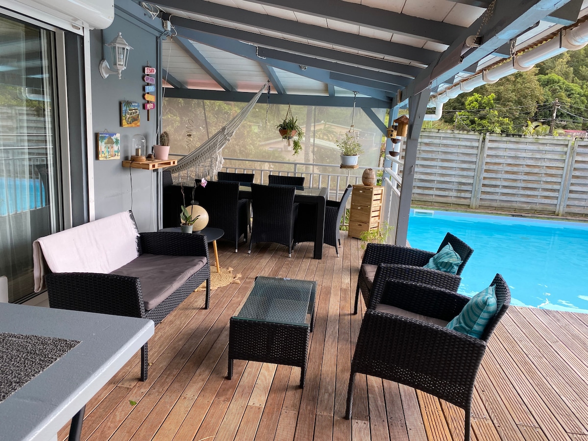 In Saint Claude, in einer ruhigen und belüfteten Wohngegend am Fuße der Soufrière Gemütliche und gut ausgestattete T2-Ferienhäuser mit einer Fläche von 36 m2 mit Terrasse Ein großer Gemeinschaftspool (8 m ×4 m) mit Blick auf das Meer, die Soufrière und die Karibik, ein Carbet zum Grillen und gesellige Momente in einer Oase tropischer Vegetation.