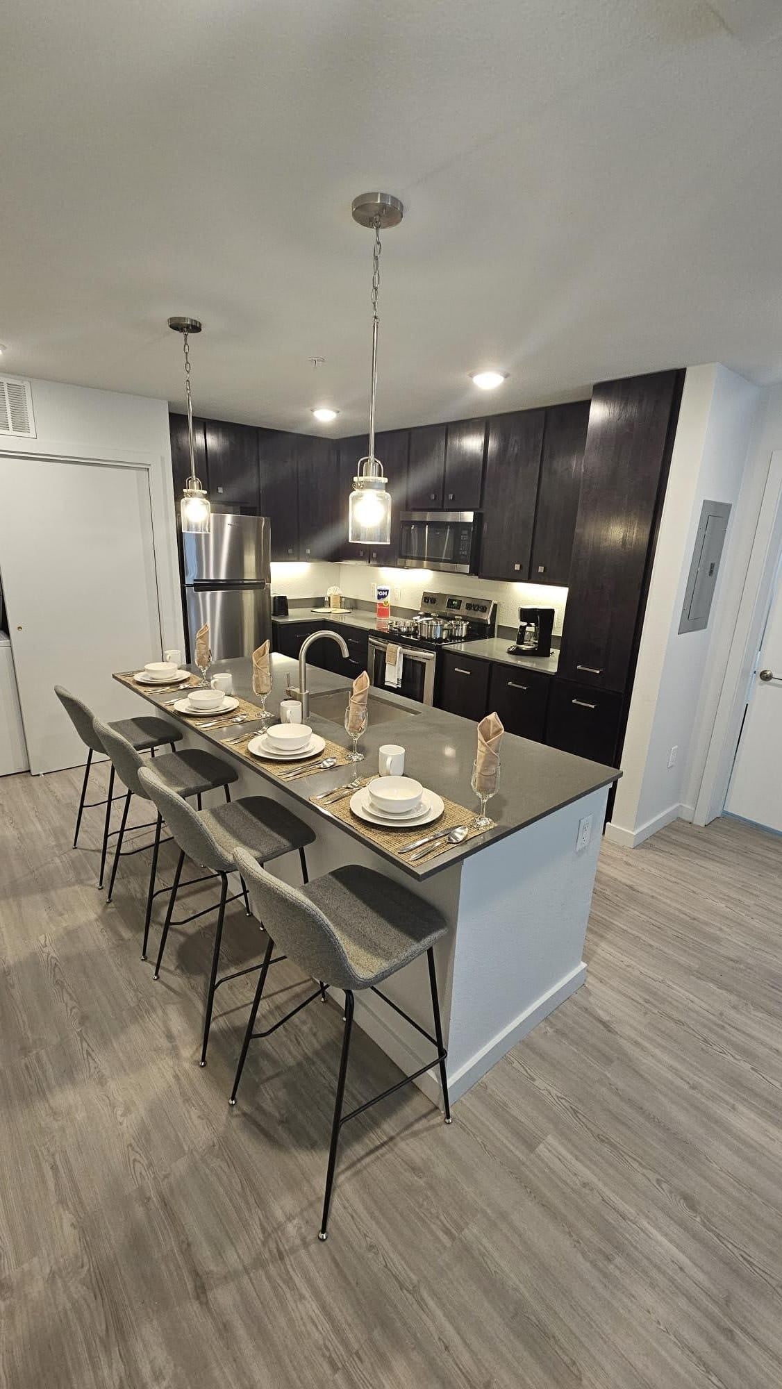 Unsere gemütliche Wohnung mit 1 Schlafzimmer ist der perfekte Rückzugsort für Paare oder Alleinreisende, die sowohl Komfort als auch Bequemlichkeit suchen. Tritt ein und entspanne dich im wunderschön eingerichteten Wohnzimmer mit einem 55-Zoll 4K-Roku-Fernseher - ideal für Filmabende oder nach deinen Lieblingssendungen. Das einladende Schlafzimmer verfügt über ein gemütliches Queensize-Bett, einen speziellen Schreibtisch für Produktivität und ausreichend Stauraum für alle deine Sachen. Genieße eine geräumige Gartenwanne und einen Doppelwaschbecken, die deinen Aufenthalt entspannend machen.
