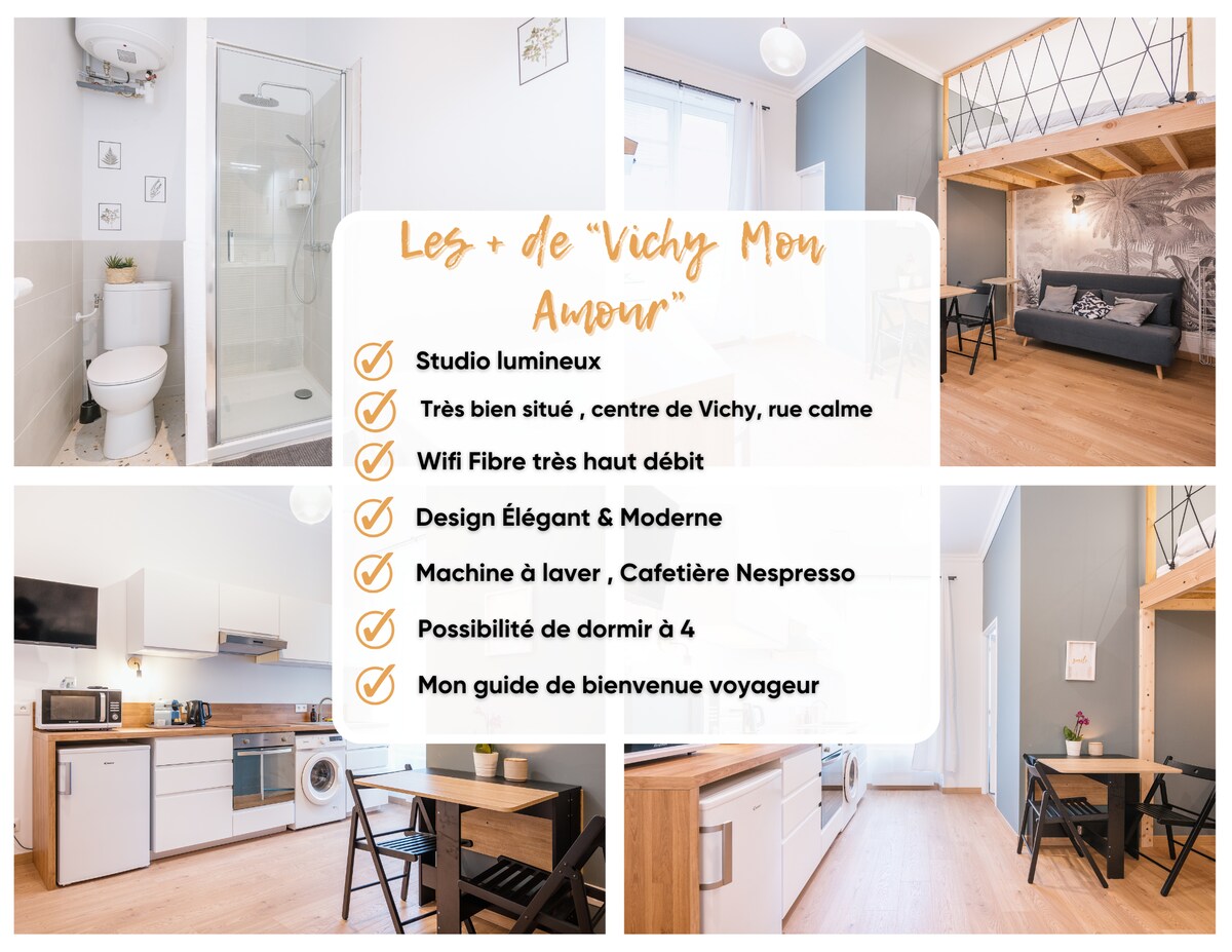 Ihr leuchtender Kurzurlaub im Herzen von Vichy Eine authentische Auszeit Entdecken Sie ein Studio, das einen komfortablen, warmen und idealen Aufenthalt im Herzen von Vichy bietet, nur einen Katzensprung von den schönsten Orten der Stadt entfernt: Thermen, Geschäfte und Spaziergänge. Im 1. Stock der Villa Marie Céline gelegen, vereint „Vichy mon amour“ Charme, Helligkeit und Funktionalität: die perfekte Adresse für eine Thermalkur, ein Wellness-Wochenende, eine Geschäftsreise oder einen romantischen Kurzurlaub.