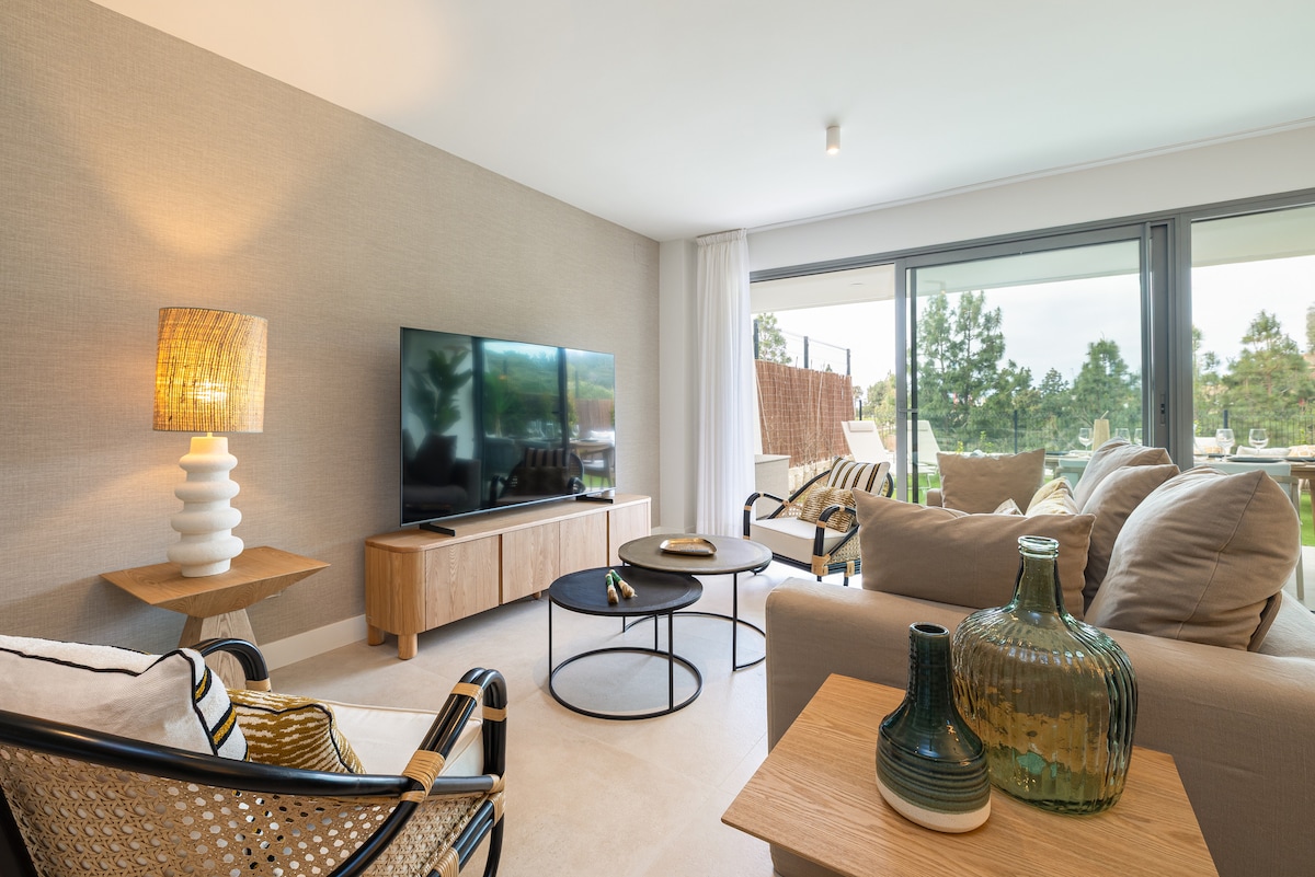 Geräumige, elegante und moderne Wohnung in einer luxuriösen Wohngegend direkt im Herzen der Costa del Sol. Entspannender Wohnraum über eine voll ausgestattete, makellose Küche mit Frühstücksinsel. Sonnenbadebereich mit privatem Garten, Grillplatz und Poolblick. Entspannende Sofas und ein wunderbarer Esstisch im Freien. Hauptschlafzimmer mit eigenem Bad und Ankleideraum. Zweites Schlafzimmer mit einem Doppelbett, Zugang zur Terrasse und eigenem Badezimmer. 2 private Parkplätze.