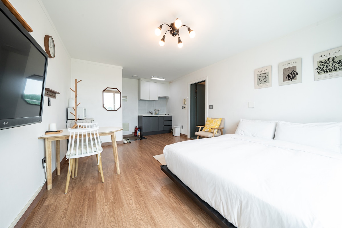 Es befindet sich im Dorf Daepo-dong direkt neben dem Jungmun-Tourismuskomplex in Seogwipo-si. Daepo-gu ist 5 Minuten zu Fuß von der Unterkunft entfernt. Die Stadtbusse fahren die Seitenstraßen oben und unten Wenn Sie den Flughafenbus benutzen, können Sie in Daepo-gu aussteigen. Die Unterkunft befindet sich im 2. Stock eines 2-stöckigen Hauses Der Besitzer wohnt im ersten Stock Die Unterkunft ist über eine Außentreppe erreichbar Hinter der Unterkunft können Sie den Hallasan sehen Rund um die Unterkunft gibt es Zitrusplantagen und Häuser Da es im Dorf ist, ist es ruhig Die Fenster sind groß, so dass es hell und kühl ist, und die Einrichtung ist ordentlich.