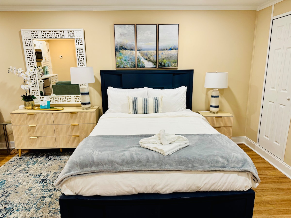 Zentrale Lage. 2 Minuten von der Autobahn, 12 Minuten von der Innenstadt, 5 Minuten vom Flughafen, Tanger Outlets & Coliseum, 10 Minuten vom Park Circle und NCHS Waterfront und 20-25 Minuten von den Stränden entfernt. Ganzes luxuriöses Studio mit privater Einfahrt und Hinterhof in einer ruhigen Gegend. Voll ausgestattete Küche, komfortables Queensize-Bett, begehbarer Kleiderschrank und Futon. Tolles Badezimmer mit geräumiger Dusche. Selbstgesteuerte Klimaanlage im Studio. Überwachungskameras auf dem Grundstück. Genehmigung für Kurzzeitvermietungen der Stadt N.C. 2024-0065