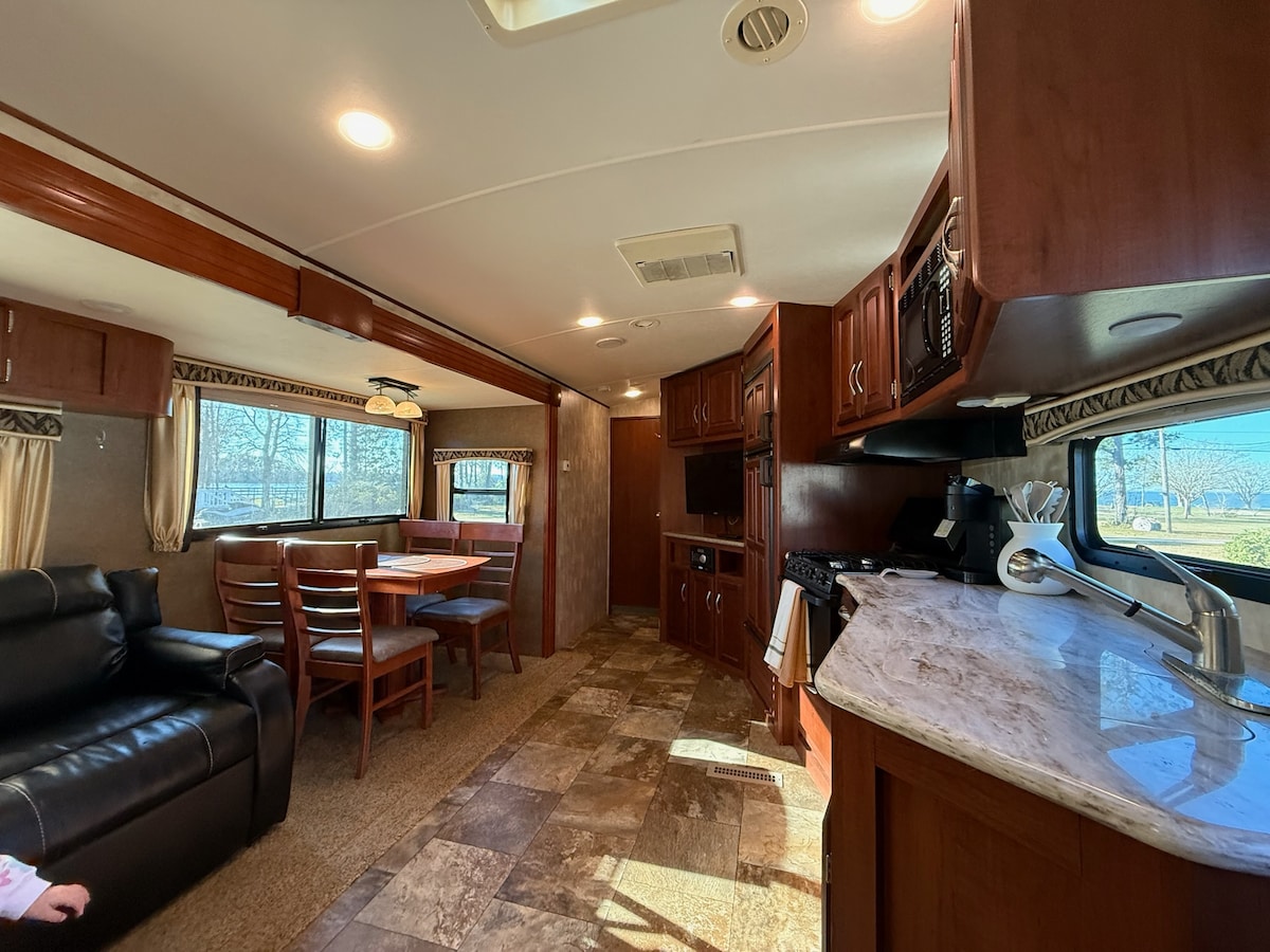 When you enter feel just like home. Comes with bathroom, TVs, 2 bedrooms, kitchen area and living space. dual climate control. Kitchen has full refrigerator, stove and oven, microwave, air fryer and Keurig. music internal and external for your enjoyment. This Location is perfectly hidden but close to CHS Airport, North Charleston Coliseum, 6 mins from downtown Charleston and 15 minutes from the beaches.