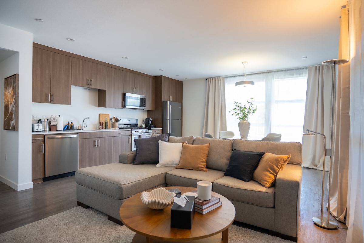 Neues Studio im Boho-Stil mit eigenem Balkon! - Fitnessraum. - Tauchbecken im Resort-Stil im Freien mit Whirlpool. - Kostenloser, reservierter Parkplatz in der Garage. - Waschmaschine und Trockner in der Unterkunft. (Waschmittel inklusive). Brandneues Kingsize-Bett mit MEMORY FOAM & stilvolles Sofa! Geräumige Badewanne mit Grundausstattung. 55-Zoll-Smart-TV mit kostenlosem Netflix. Voll ausgestattete, nagelneue Küche mit Geschirrspüler. PROFESSIONELL GRÜNDLICH GEREINIGT UND DESINFIZIERT VOR JEDEM CHECK-IN!