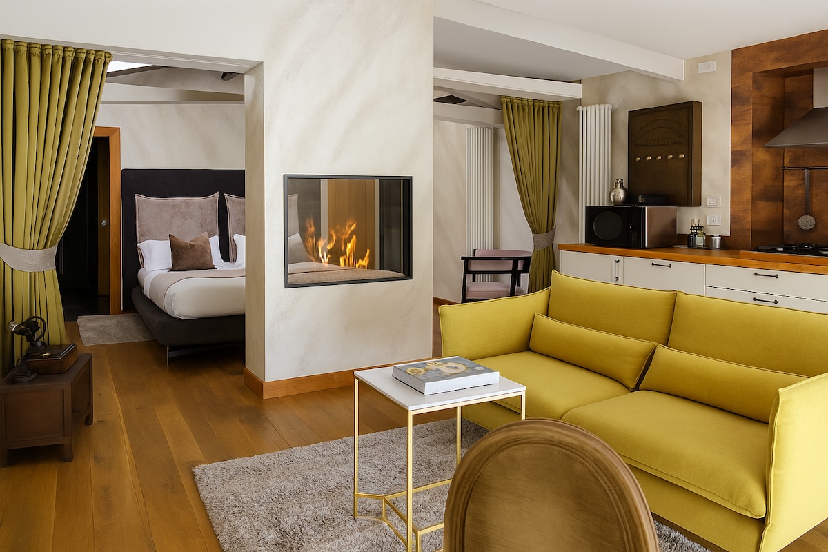 MURANO Suites - RUBINO, 70 m ² Exklusivität. Im ersten Stock mit Blick auf den Canal Grande von Murano mit einem atemberaubenden Blick von einem königlichen Bogenfenster, das das Gefühl vermittelt, im Wasser zu schlafen. Tolle Helligkeit durch 4 Dachgauben, die im freiliegenden Holzdach installiert sind. In der Mitte trennt ein zweiseitiger Kamin den Schlafbereich vom Wohnbereich, eine besondere Situation, die in ihrem Kontext wahrscheinlich einzigartig ist.