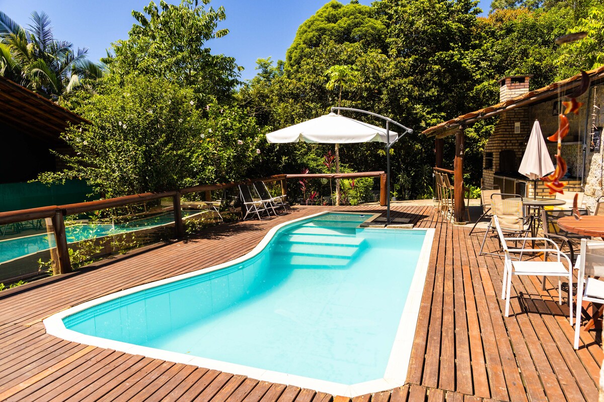 Geräumiges Wohnhaus mit 3 Suiten (zwei mit Queensize-Bett und einem Doppelbett), einer voll ausgestatteten Küche und einem Wohnzimmer mit 55-Zoll-Fernseher. Zimmer mit Klimaanlage und Balkon. 20 Minuten von der Innenstadt entfernt, bietet der Ort Ruhe und Frieden, inmitten der Natur. Entspanne dich mit dem Rauschen der privaten Wasserfälle auf dem Grundstück, wo du baden kannst. Genieße den Pool, die Terrasse mit Grill und den Gemüsegarten. Überdachte Garage für zwei Autos und großer Innenhof für mehr Autos. Ca. 1:30 h von den Stränden entfernt. Ideal für Familien