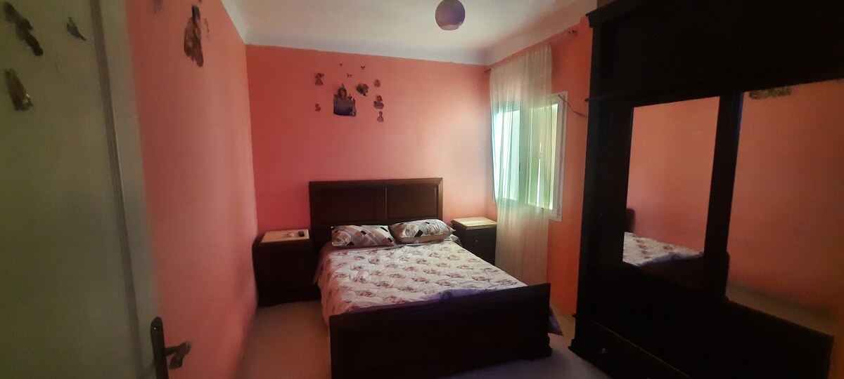 Ferienvermietung einer neuen Wohnung im ersten Stock von 90 m2 mit Schlafzimmer, einem großen Wohnzimmer, das zur Küche hin offen ist, mit allen notwendigen Geräten, heißem und kaltem Wasser rund um die Uhr, Bad, Küche mit Kühlschrank brandt 440 l, Waschmaschine brandt 10 kg, die Wohnung bietet Platz für ein Paar im Schlafzimmer und drei Personen im 30 m2 großen marokkanischen Wohnzimmer mit 55 cm Stream-TV, kostenlose Parkplätze.