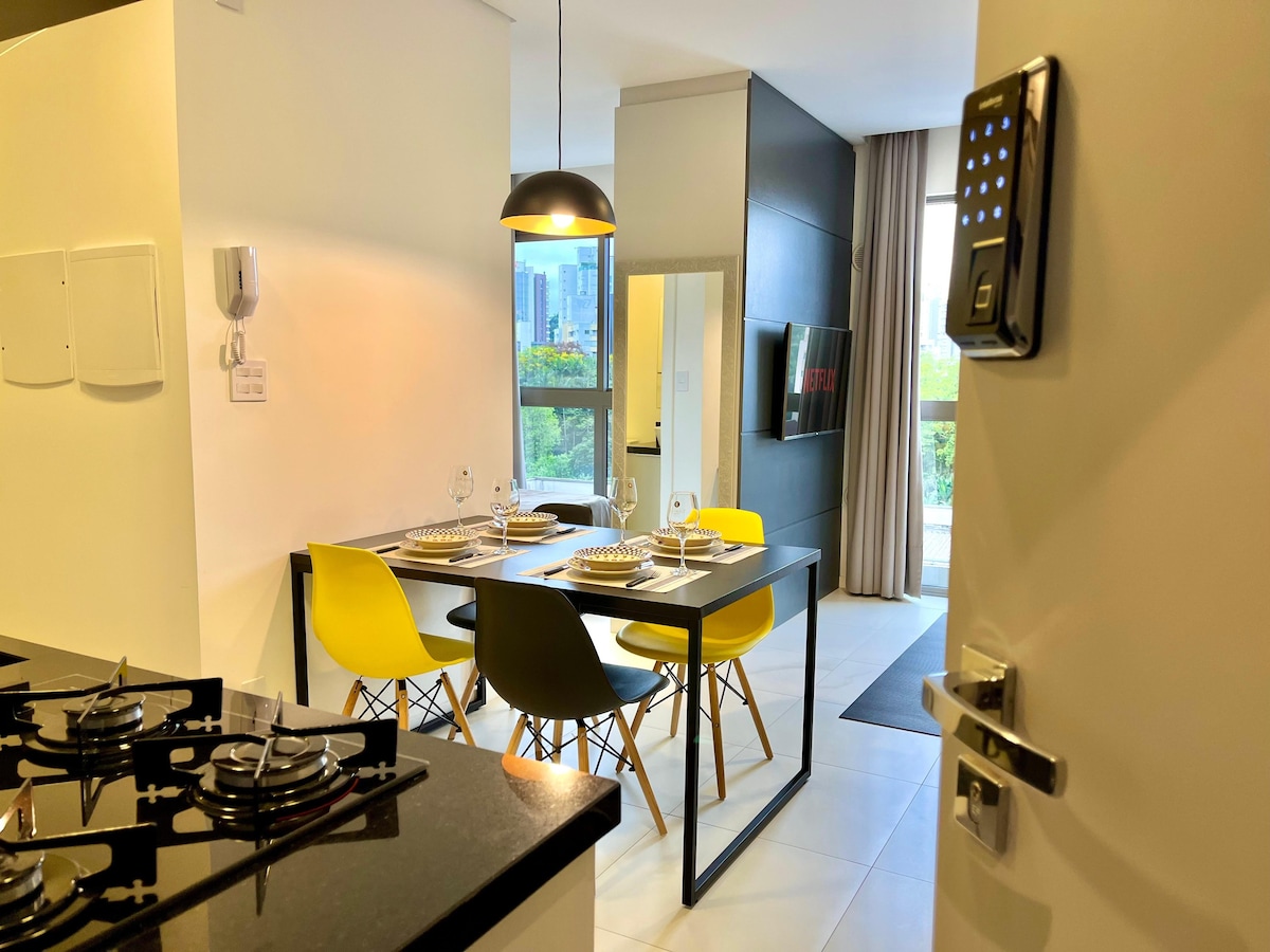 Elegante Studio-Wohnung 800 m vom Park Vila Germânica entfernt - Ort für Veranstaltungen wie das Oktoberfest. Umgeben von Restaurants, Bars und Supermärkten. Alles für Ihren Komfort: Samsung 50" Smart TV, Split-Klimaanlage, Gasdusche, 240 MB Glasfaser-WLAN, voll ausgestattete Küche mit Brastemp-Kühlschrank, Mikrowelle, Backofen, Herd, Dunstabzugshaube, Kaffeemaschine, Wasserreiniger, Waschmaschine und Trockner, Kleiderschrank und natürlich ein einladendes Queensize-Bett mit der besten Matratze!