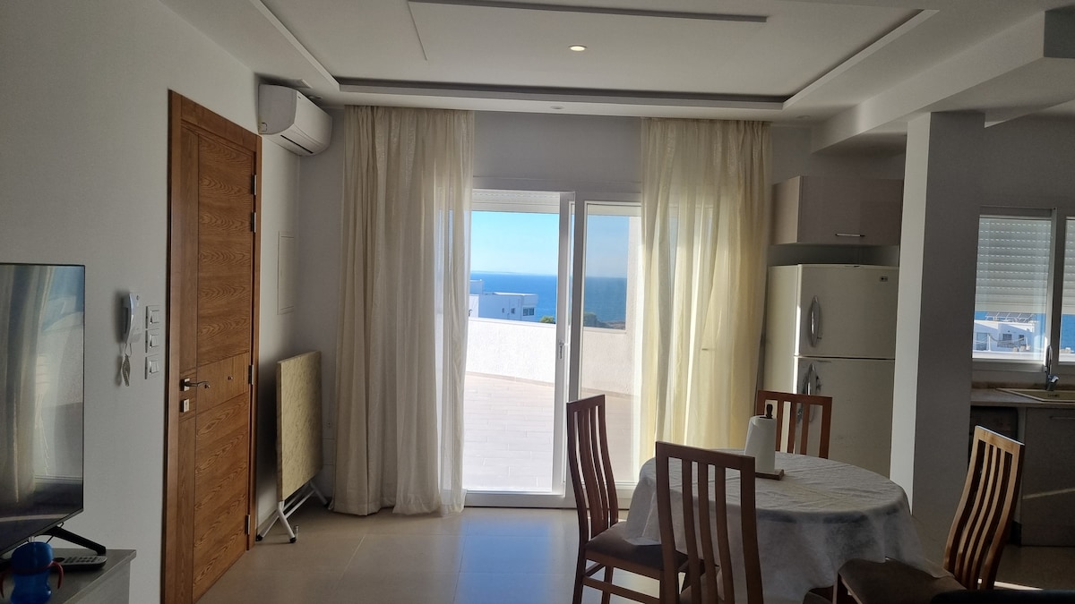 Entdecke eine luxuriöse Wohnung mit Meerblick im Herzen der Stadt. Wache in zwei Schlafzimmern mit mediterranem Panorama auf und genieße Kaffee auf einer atemberaubenden Terrasse mit Blick auf die Küste. In der Nähe der Medina und nur wenige Minuten mit dem Taxi von Port El Kantaoui entfernt, bietet diese stilvolle Unterkunft hochwertige Möbel, eine gut ausgestattete Küche, WLAN, einen Smart-TV und modernen Komfort. Zwei Schlafzimmer mit Kingsize-Betten, ein Badezimmer im italienischen Stil und ein Arbeitsbereich sorgen für einen perfekten Rückzugsort in der Stadt mit einfachem Zugang zu Cafés, Restaurants und Bars.