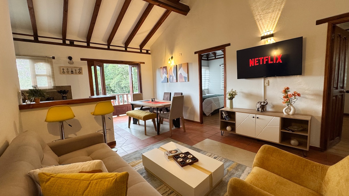 Villa de los Juanes ist ein perfekter Rückzugsort zum Entspannen und Verbinden mit der Natur. Unser gemütliches Haus bietet zwei unabhängige Zimmer mit Doppelbetten, ein Esszimmer, ein Badezimmer mit elektrischer Dusche, ein Arbeitszimmer, eine voll ausgestattete Küche, eine Außenterrasse mit Grill, einen privaten Parkplatz und 3.400 Quadratmeter Grünfläche. Wir bieten schnelles WLAN, Fernseher, Bücher und Brettspiele. Lass dich von der Ruhe verzaubern, die dieser schöne Ort inspiriert. Nur eine 10-minütige Fahrt von Villa de Leyva (5 km) entfernt.