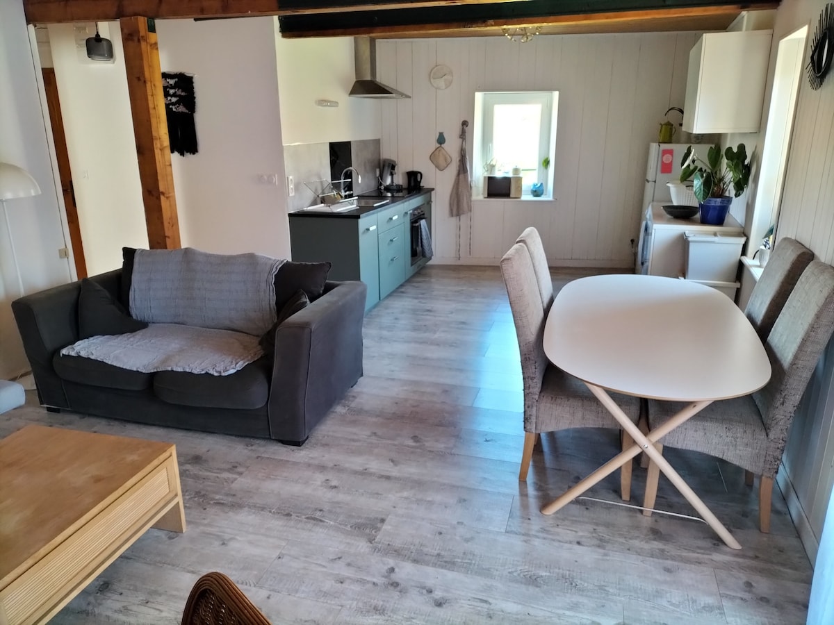 Schönes Einfamilienhaus in einem sehr ruhigen Dorf, auf dem Land. Panoramablick auf die Berge der Auvergne. Ideal für ein Paar oder eine Familie (ein Paar + 1 oder 2 Kinder). 45 m2. Haupteingang zur Küche, offen zu einer schönen schattigen Terrasse und einem Garten. Im Erdgeschoss, Schlafzimmer mit Doppelbett, separater Eingang, Bad. Im Obergeschoss Wohnzimmer mit Schlafsofa (bequemes Bett), TV. 5 km zu allen Geschäften und Dienstleistungen, Schwimmbad, etc...