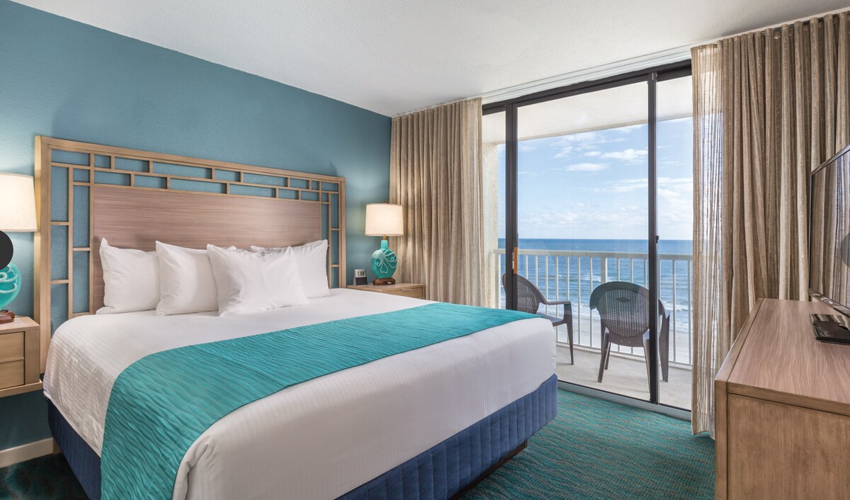 Diese wunderschöne 1BR, 1BA Oceanfront Suite, bietet Platz für 5 Personen und ist sehr geräumig. 1. Stock mit eigenem Balkon und herrlichem Blick auf den Ozean. 1Br mit Kingsize-Bett, Wohnzimmer verfügt über eine Pull-Down-Murphy und Schlafsofa. Granittheken in Küche und Bad mit großer Dusche und voll effizienter Küche. 2 Fernseher, WLAN, Bügeleisen, Föhn, 2 Pools im Innen-/Außenbereich, 2 Whirlpools im Innen-/Außenbereich, fauler Fluss, Liegestühle/Sonnenschirme und ein kurzer Spaziergang zum Strand. Fragen Sie nach unseren Flitterwochen-/Jubiläumspaketen, die wir anbieten.