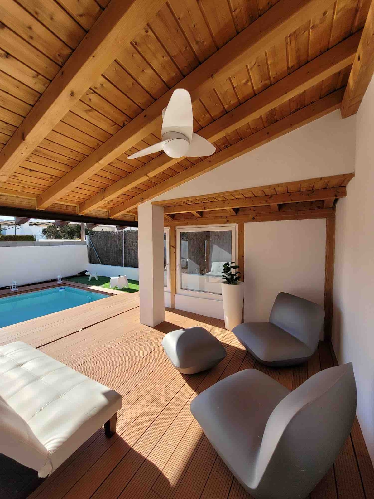 Abseits der ausgetretenen Pfade. Entspanne dich in dieser ruhigen, stilvollen, einstöckigen 100 m² großen Villa mit vollständig umzäuntem Garten, zentraler Klimaanlage, WLAN, EV-Ladegerät und modernen Annehmlichkeiten. Egal, ob du auf einer kurzen, erholsamen Reise hier bist oder länger bleibst, das Haus wurde durchdacht geplant und gestaltet, um ein komfortables und einladendes zweites Zuhause zu sein. Genieße ein erfrischendes Bad im privaten Pool, eine gemütliche Siesta im Garten oder abends ein Essen im Freien auf der Terrasse.