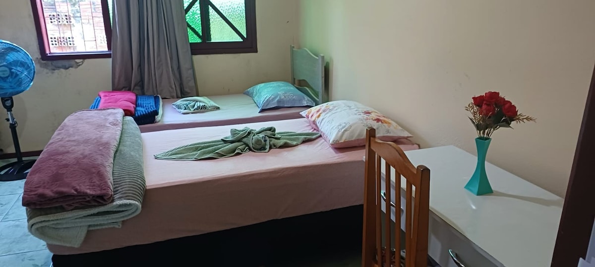 Quarto duplo aconchegante em pousada totalmente equipada.