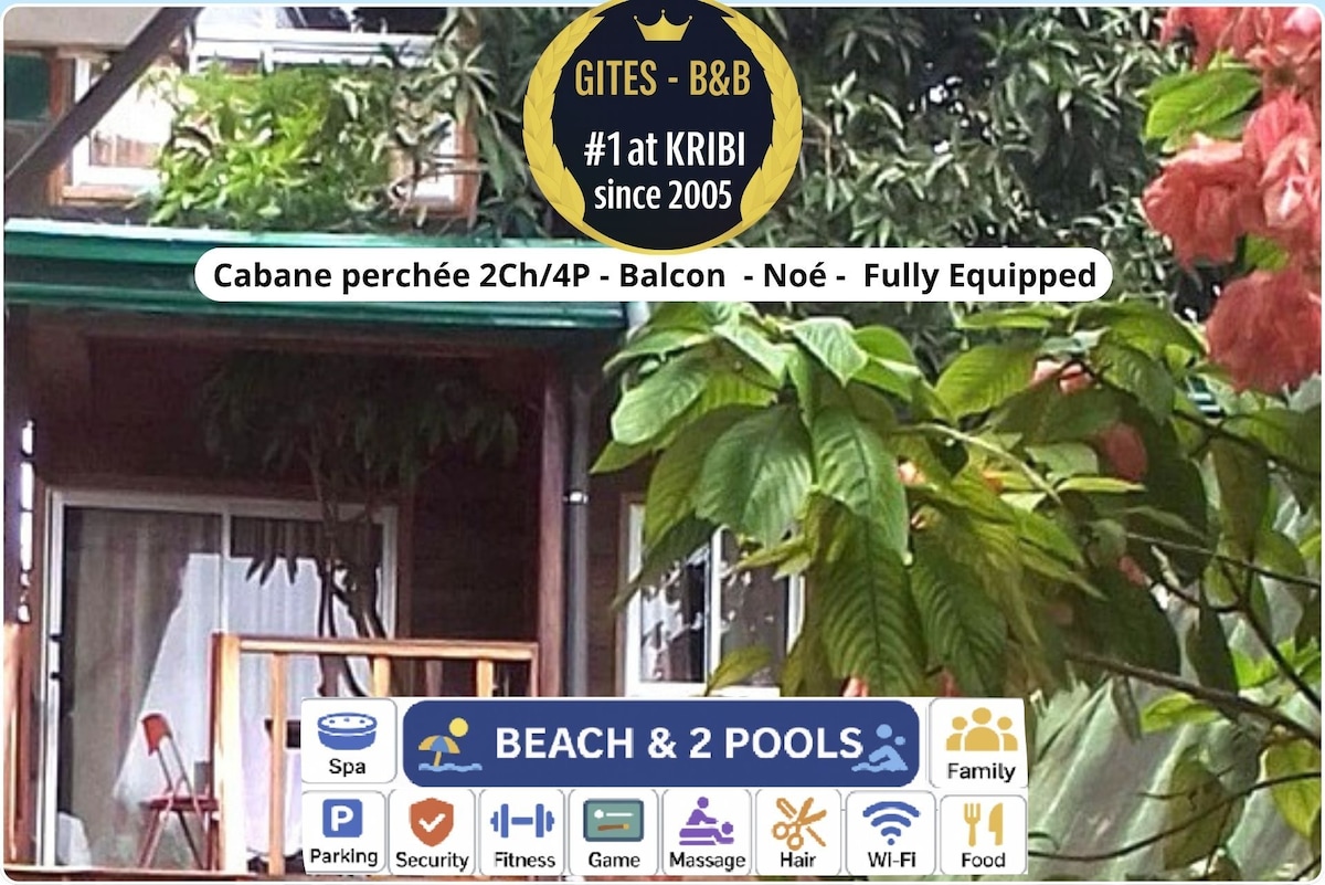 Hochgelegene Hütte aus lokalem Azobé-Holz für einen ungewöhnlichen Aufenthalt im Herzen der Natur. Atmosphäre „Zurück zu den Wurzeln“ in einer grünen Umgebung. Ideal für Paare oder kleine Familien auf der Suche nach Wiederverbindung. Zugang zu den Infrastrukturen des Hotels, um Komfort und Abenteuer zu verbinden